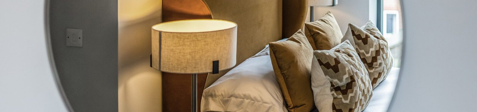 The second bedroom offers a soft contrast, with an upholstered bed in taupe velvet dressed in champagne coloured bedding and cushions. The lighter furniture makes this space feel brighter. Together, these bedrooms create a harmonious balance of sophistication and effortless comfort.