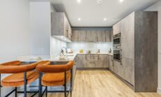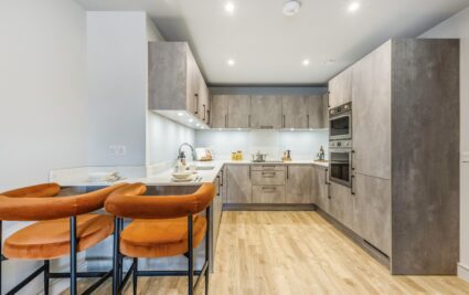 The open plan living area has been designed with modern living in mind, featuring a sleek handleless Häcker kitchen with Silestone Calacatta worktops, Siemens integrated appliances and ambient LED lighting. Full-height windows flood the space with light and open onto a private terrace that spans the width of the apartment — perfect for entertaining or unwinding outdoors.