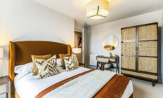 The bedroom includes fitted glass sliding wardrobes with internal lighting, soft wool carpets, and direct access to the terrace. A beautifully finished bathroom completes the home, showcasing Villeroy & Boch sanitaryware, Dornbracht brushed dark platinum brassware, and elegant marble-effect tiling.