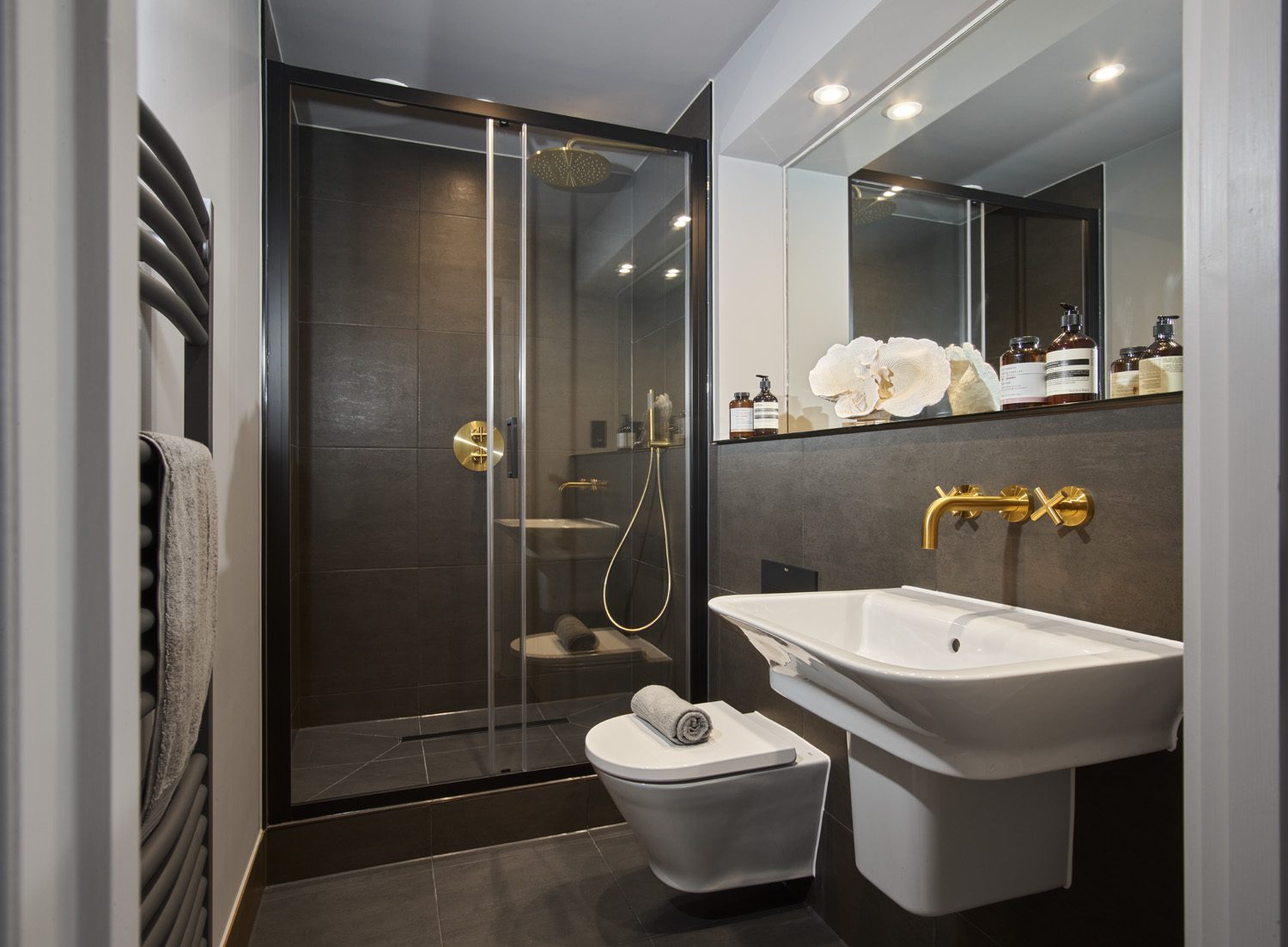 Upstairs, the mezzanine principal bedroom features a luxurious ensuite, fitted wardrobes, and a private west-facing balcony, ideal for evening sunsets. A second double bedroom and a high-quality bathroom provide versatile space for guests, family, or a home office. The apartment also benefits from allocated EV parking, a concierge service, and access to beautifully landscaped private gardens.