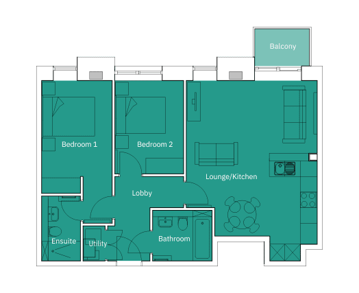 Get onto the property ladder with a 5% deposit contribution in this stylish two-bedroom apartment, the perfect choice for first-time buyers. The open plan kitchen, living and dining area makes everyday living easy and sociable, complete with a modern breakfast bar that’s ideal for casual meals or entertaining friends. Full-height doors lead onto your own private balcony, overlooking beautifully landscaped gardens, the perfect spot for morning coffee or evening drinks.