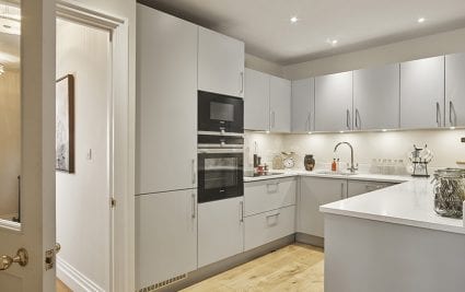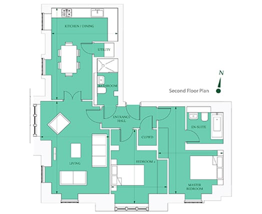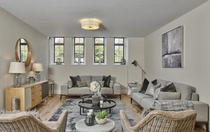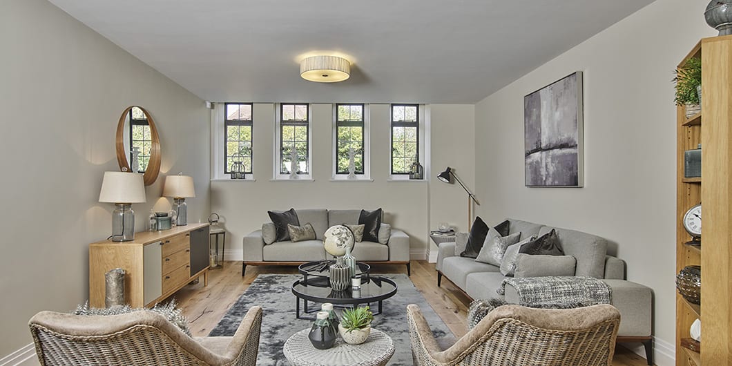This light and airy two bedroom conversion apartment is located on the second floor of the sanatorium. Perfect for simply relaxing or entertaining friends, this beautiful home features a spacious, dual-aspect living room which is flooded with light from the restored feature windows.