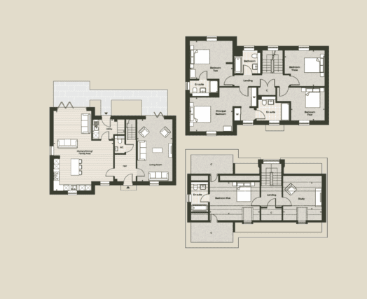 The first floor is home to four double bedrooms, including the principal suite with fitted wardrobes and a stylish en-suite with walk-in shower. Bedroom 2 also benefits from its own en-suite, while a well-appointed family bathroom with a bath serves the remaining bedrooms.