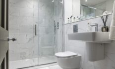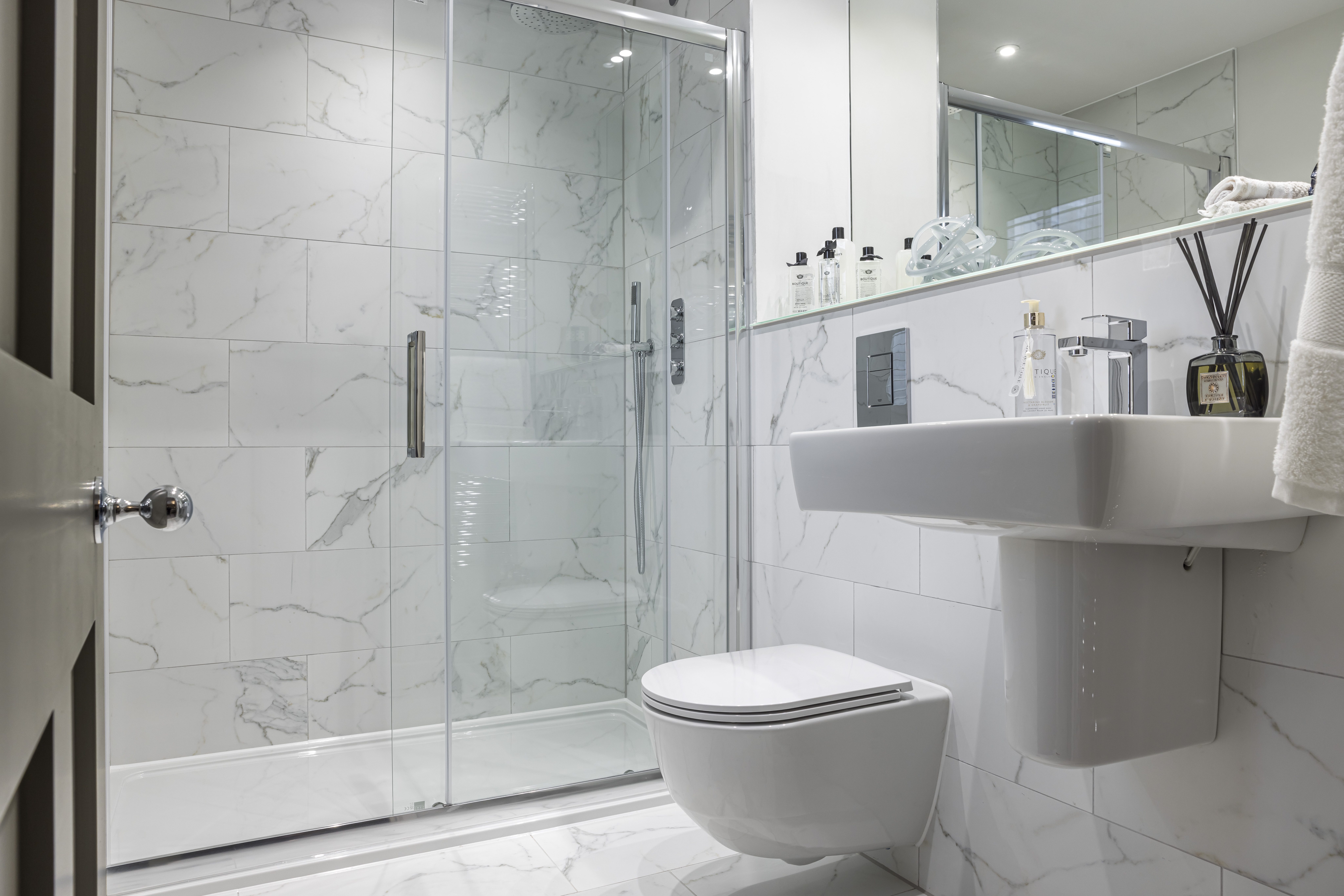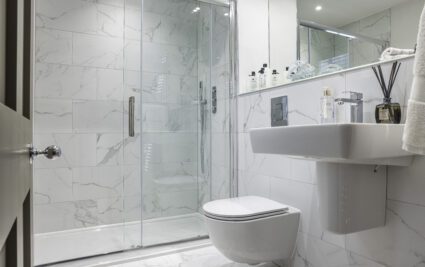 Upstairs, the principal bedroom combines comfort and style, with fitted glass-fronted wardrobes, space for a dressing table or home workspace, and a luxurious en-suite finished with Vado brassware, Laufen ceramics, and polished porcelain tiles. A sophisticated family bathroom with matching Laufen fittings serves the second bedroom and guests.