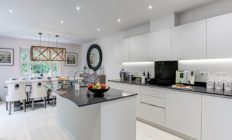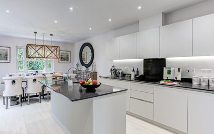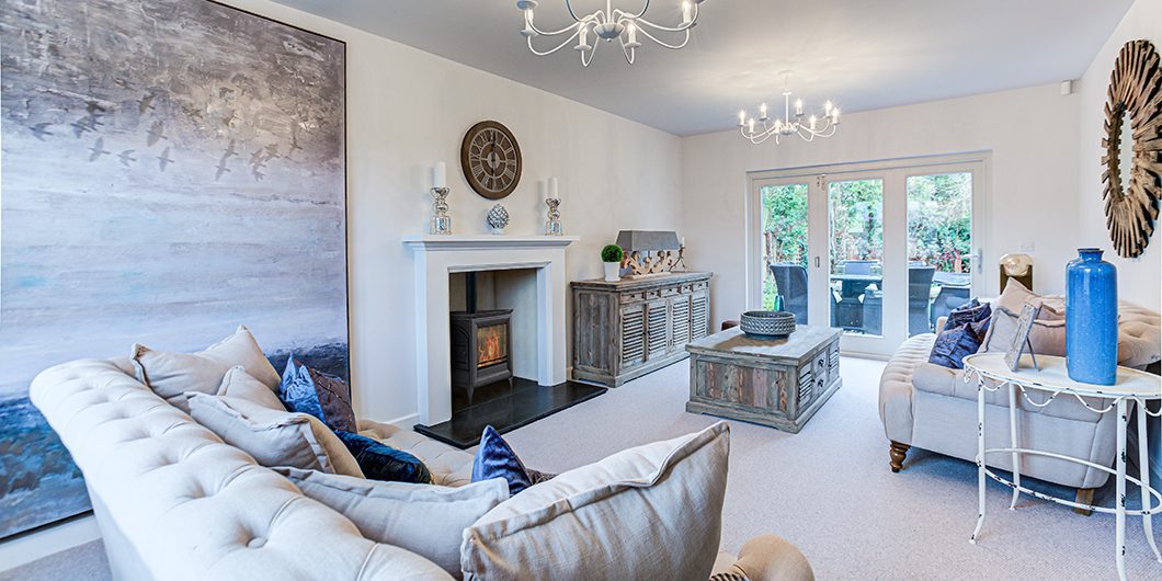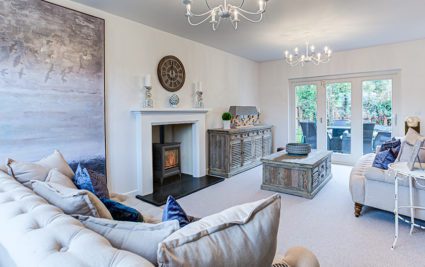 A modern light-filled four bedroom detached house featuring a separate living room with a feature fireplace and a generous master suite.