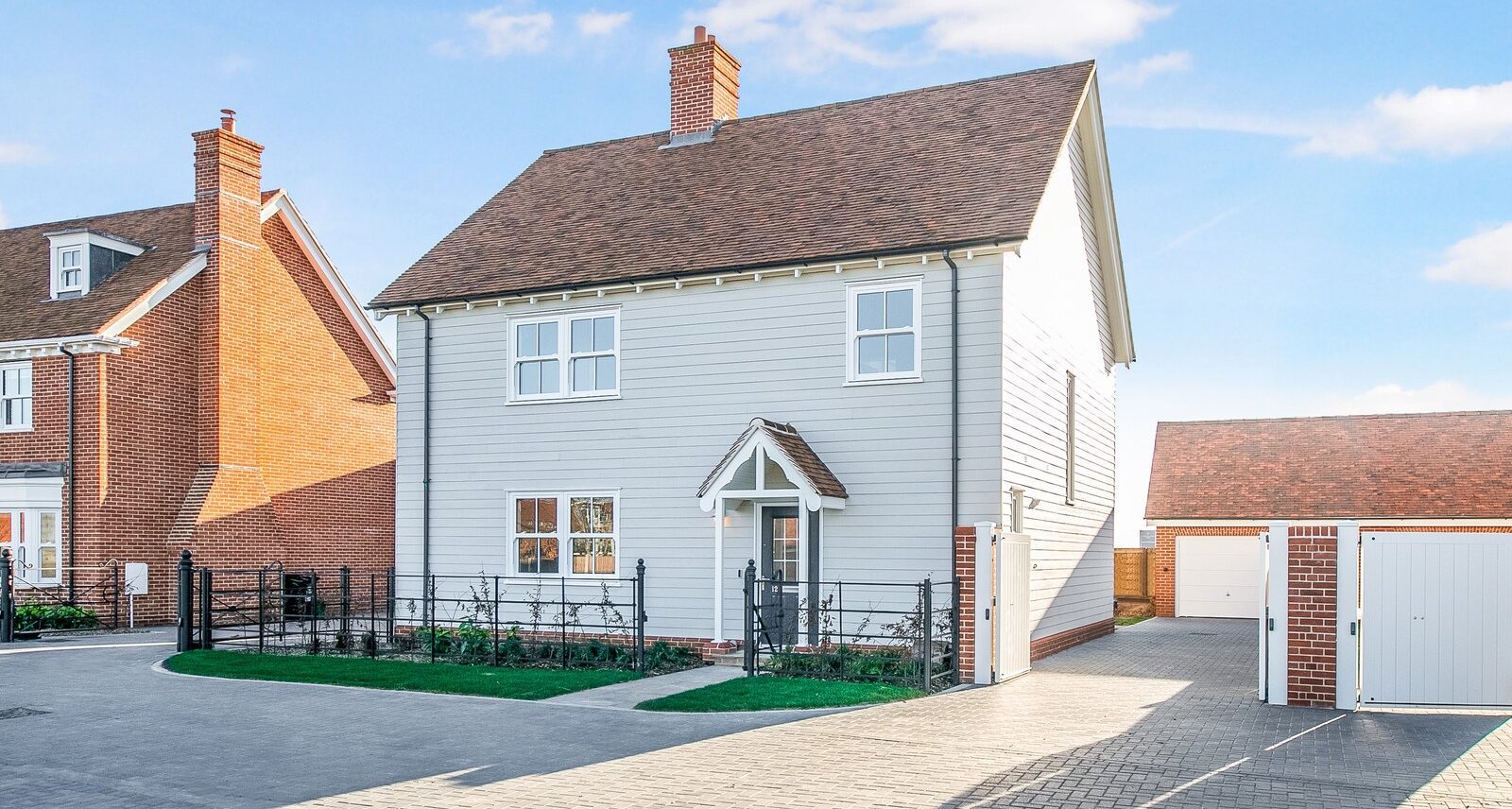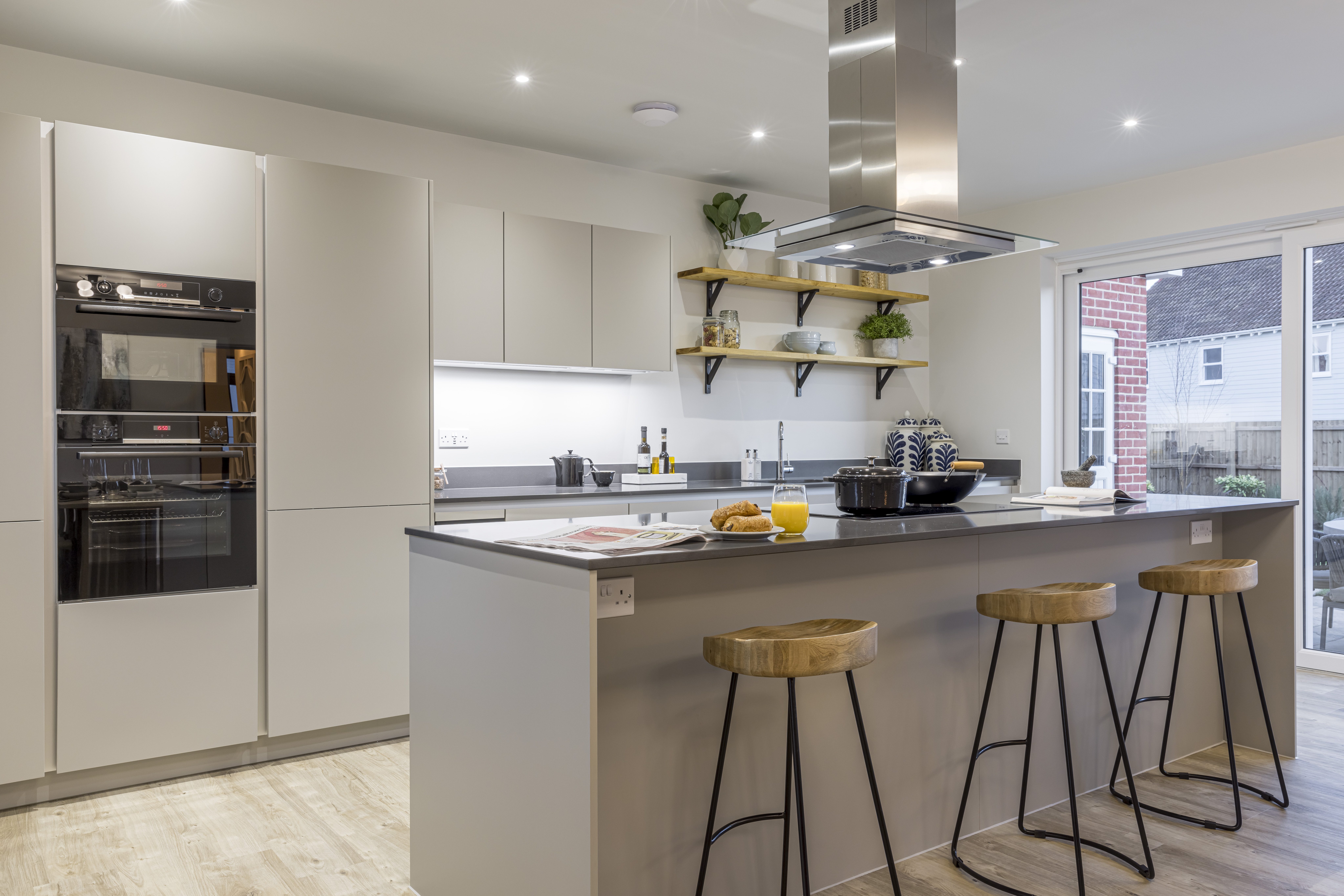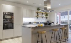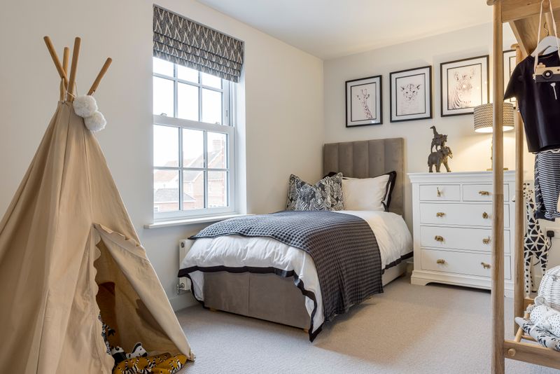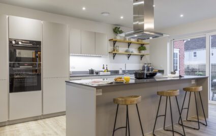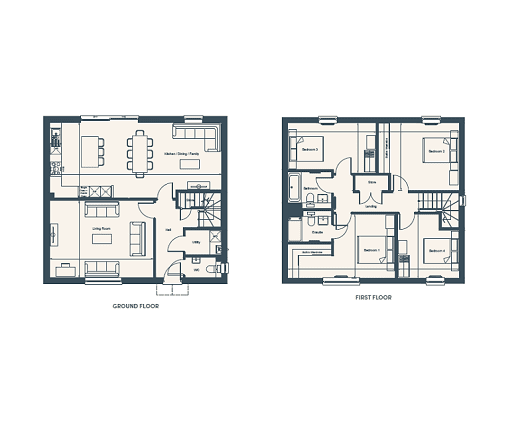 The Langdon is a spacious Hardiplank-finished home featuring a separate living room with desk space and a generous principal bedroom suite. The open-plan kitchen, dining, and family room includes integrated appliances like a Caple wine cooler and Bosch induction hob, with sleek Silestone worktops and handleless matt-finished doors. The family area, with Amtico sun-bleached oak flooring and large sliding doors to the landscaped garden, is ideal for socializing. The principal and secondary bedrooms have fitted wardrobes, with the principal offering a dressing area and en-suite. Two additional double bedrooms and a family bathroom complete the first floor.