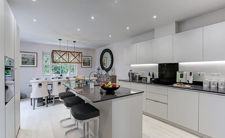 The Rochford features a bright and airy kitchen and dining room which benefits from fully-integrated Bosch and Zanussi appliances and an island with a Silestone worktop. Both this space the separate living room provide access to the private garden and are perfect spaces for spending time as a family, with the living room featuring bi-fold doors as well as a functioning fireplace for cosy nights in. This home also benefits from a light-filled study, which coupled with high speed broadband makes working remotely easy.