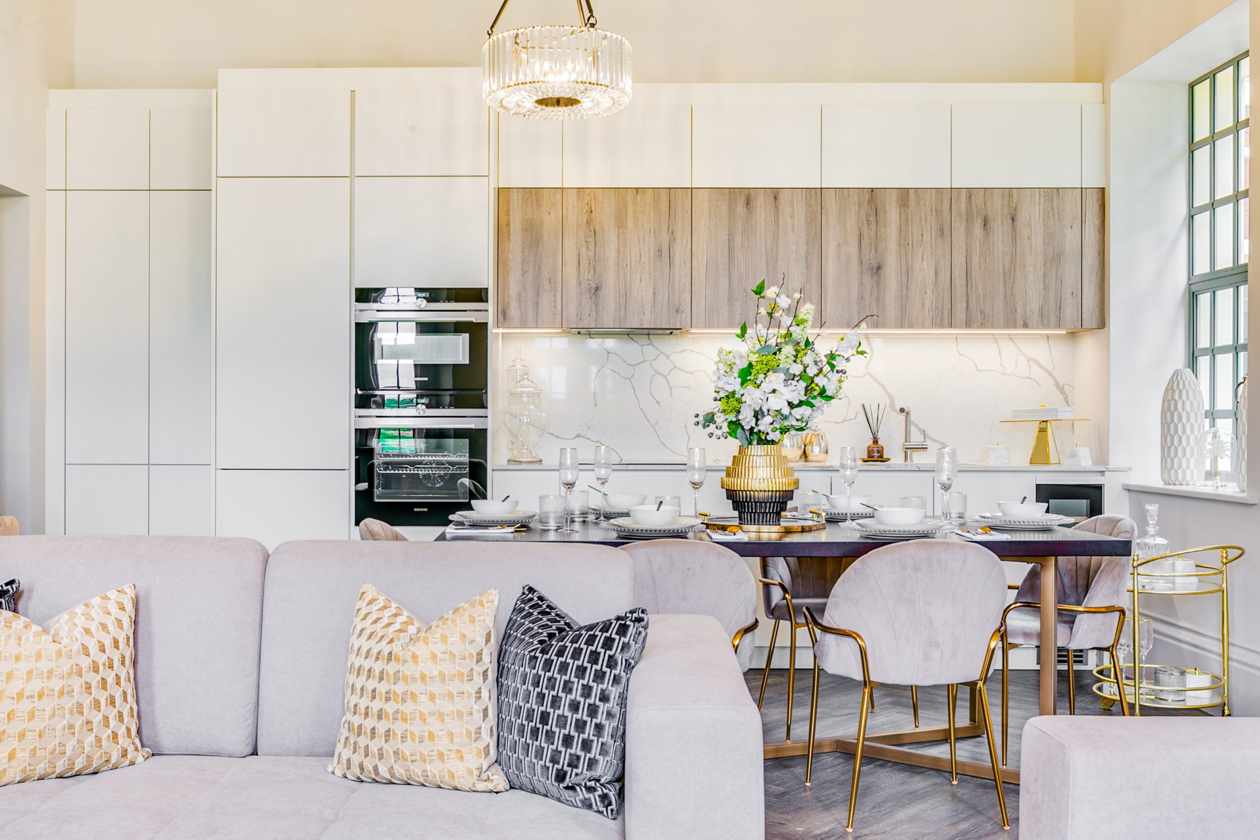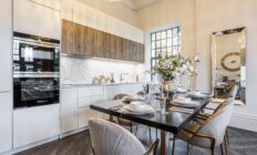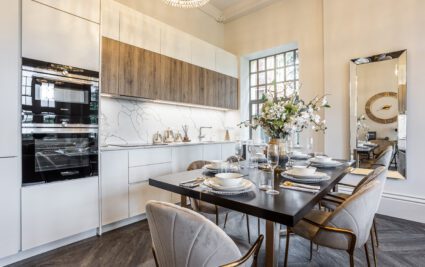 Apartment OR15 is a stylish 1-bedroom home on the first floor, featuring an open-concept living, dining and kitchen area with white stone worktops, matching full-height stone splashback, integrated Siemens appliances and ample counter space. The bedroom includes a fitted wardrobe, and a modern bathroom featuring Villeroy & Boch sanitaryware, a bathtub and utility area adding convenience, making it the perfect choice for contemporary living in a prime location.
