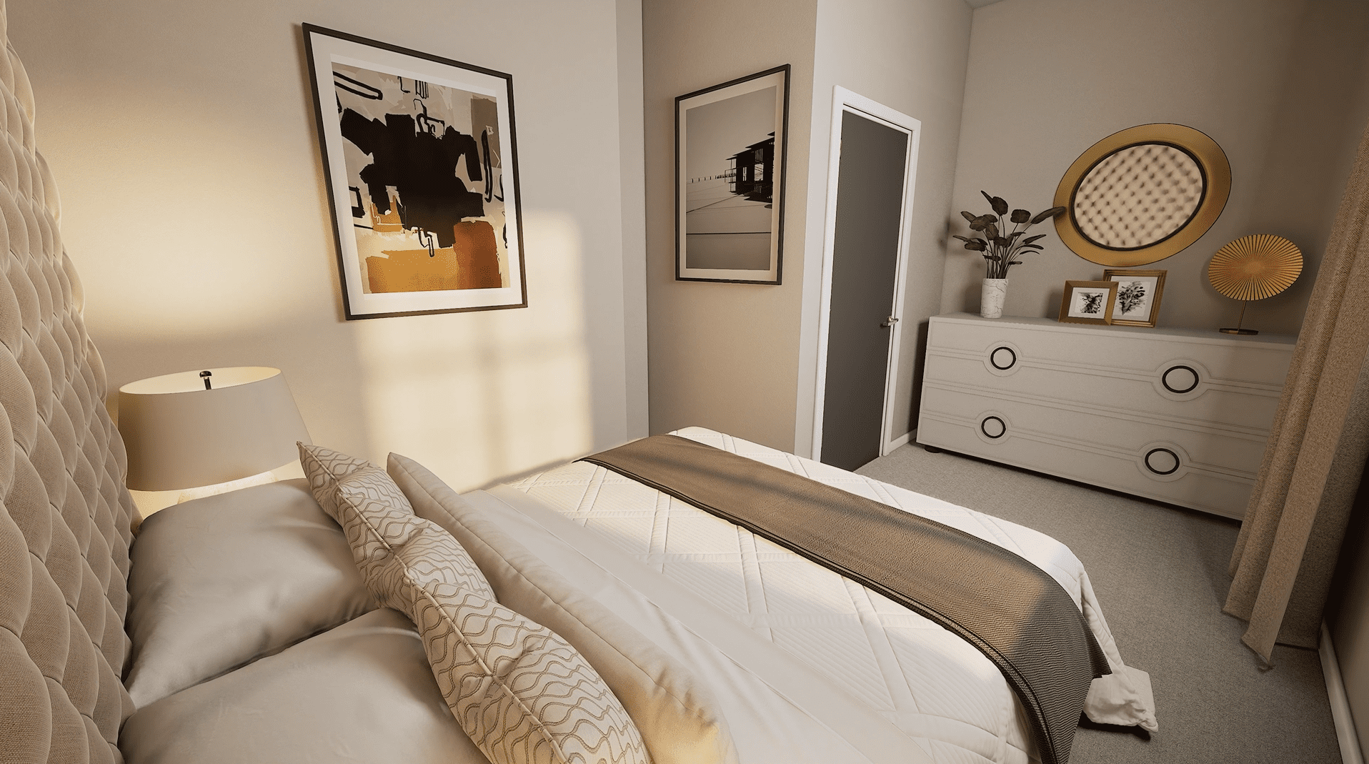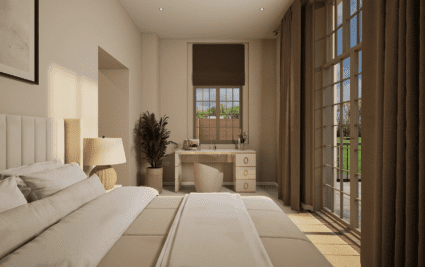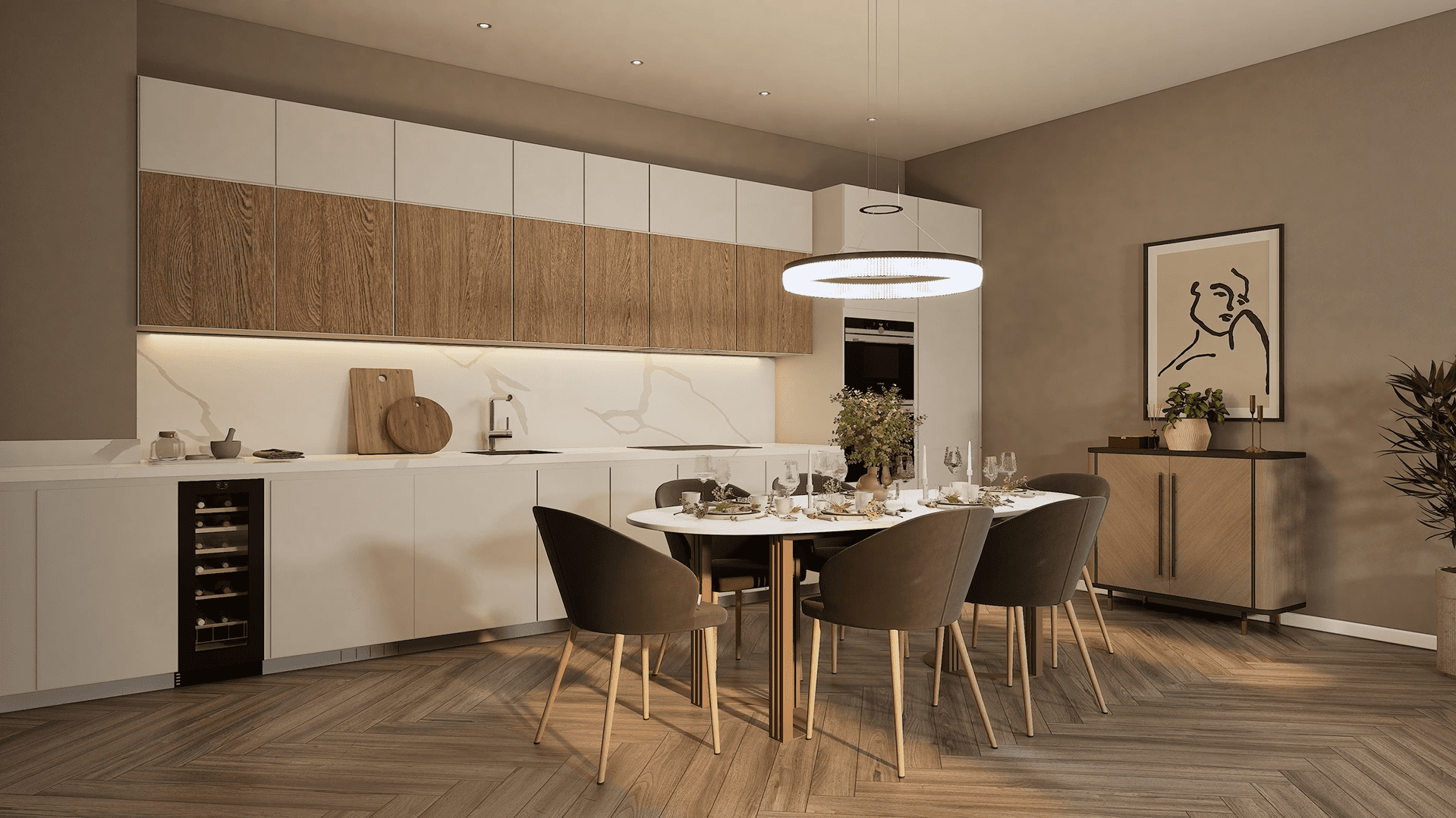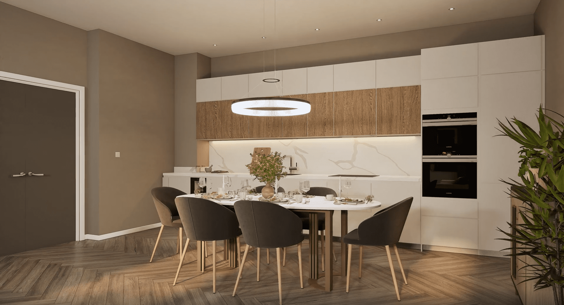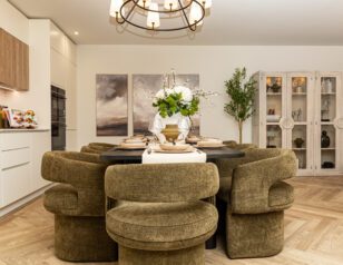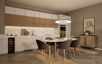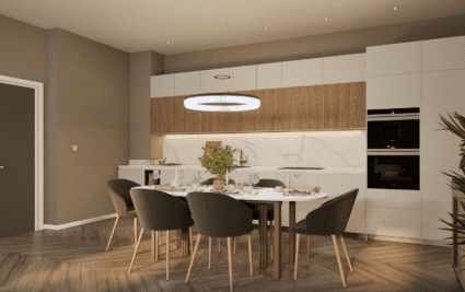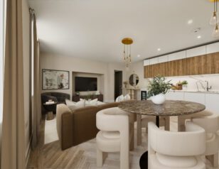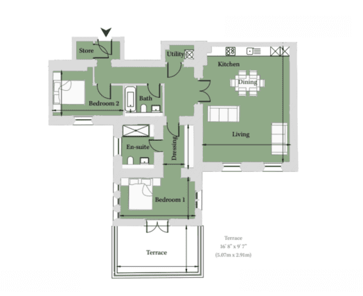 Apartment OR16 is an elegant two-bedroom ground-floor residence. A standout feature of this home is the private terrace, accessed directly from the principal suite, offering stunning views across the landscaped gardens, a perfect setting for warm summer evenings or outdoor dining. The spacious open-plan kitchen, dining, and living area is beautifully finished and features integrated Siemens appliances, generous counter space, and a refined, contemporary aesthetic. The principal suite includes a bespoke dressing area with fitted wardrobes, a sleek en-suite, and direct access to the terrace. A contemporary family bathroom with a bathtub and a dedicated utility area add further comfort and convenience. Combining stylish interiors with enviable outdoor space, Apartment OR16 offers an exceptional setting for modern living.