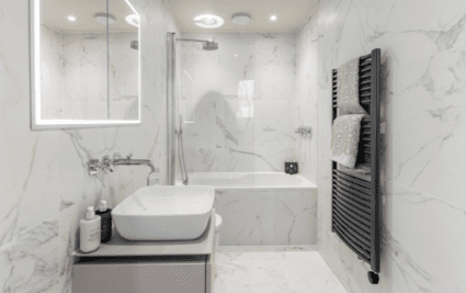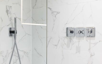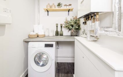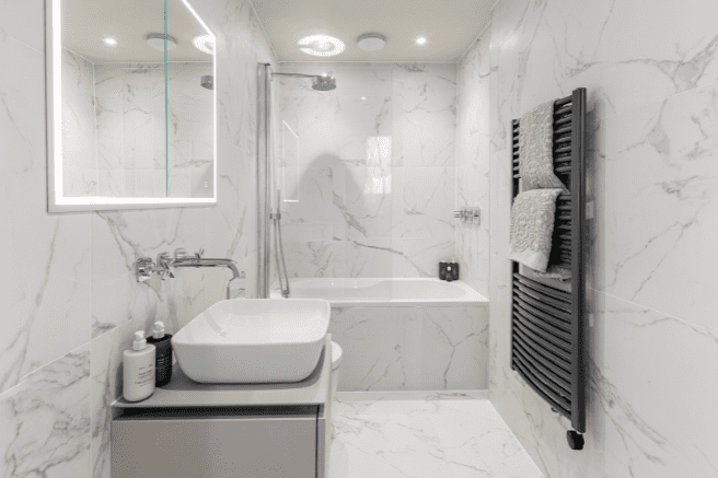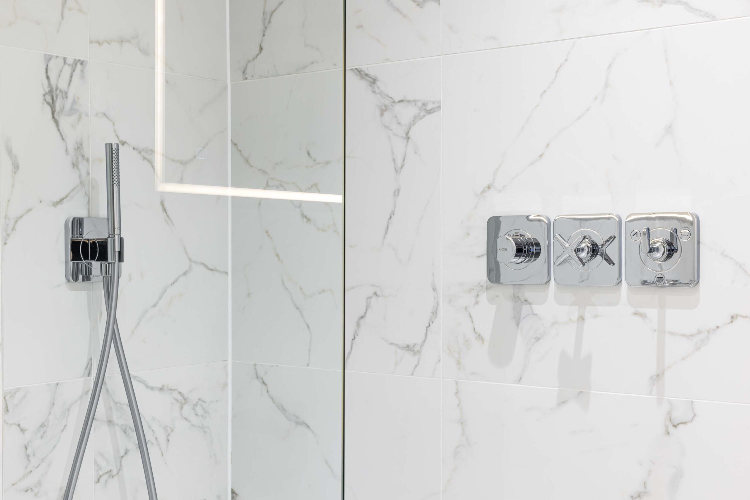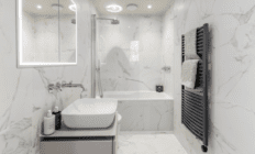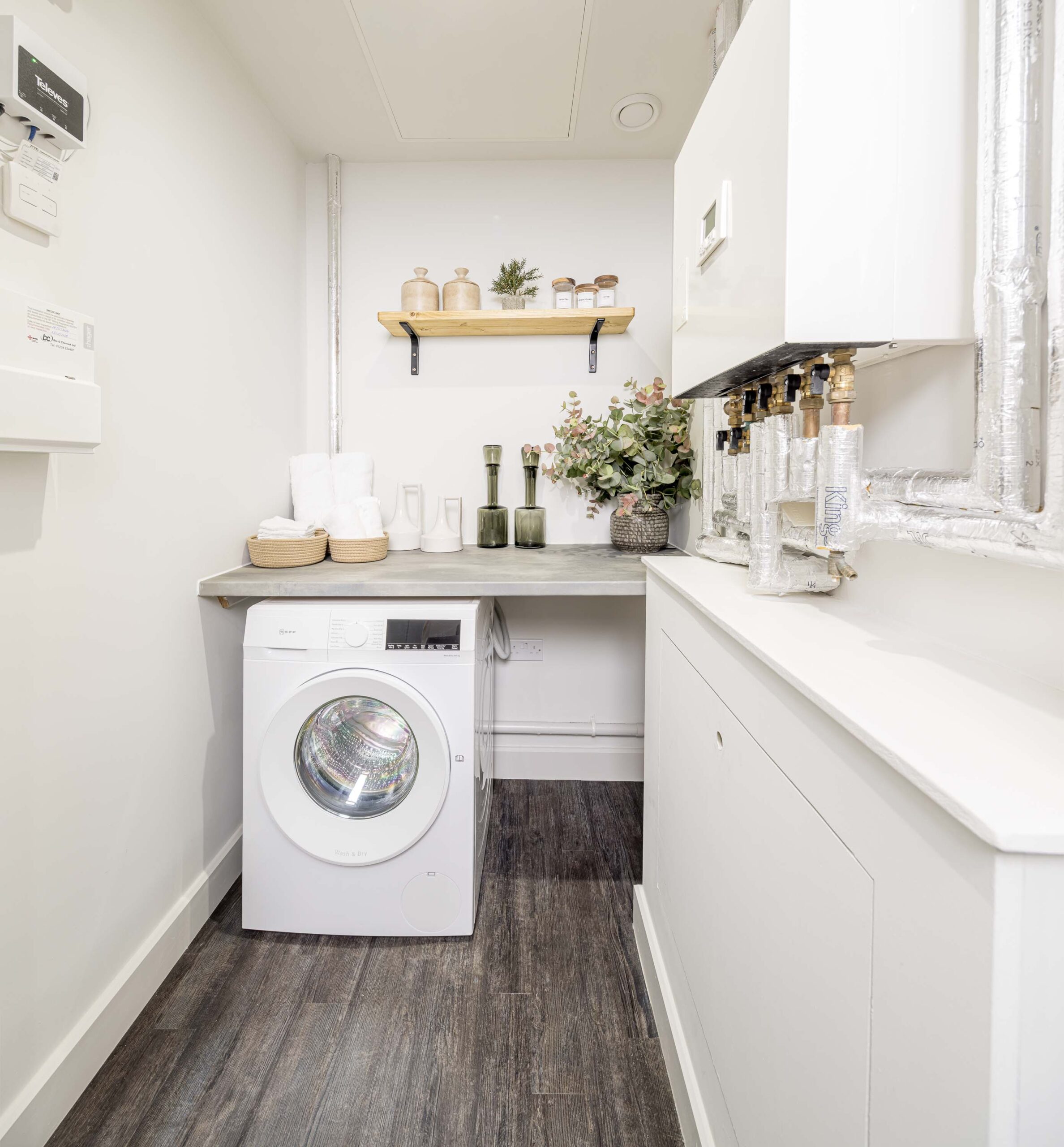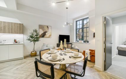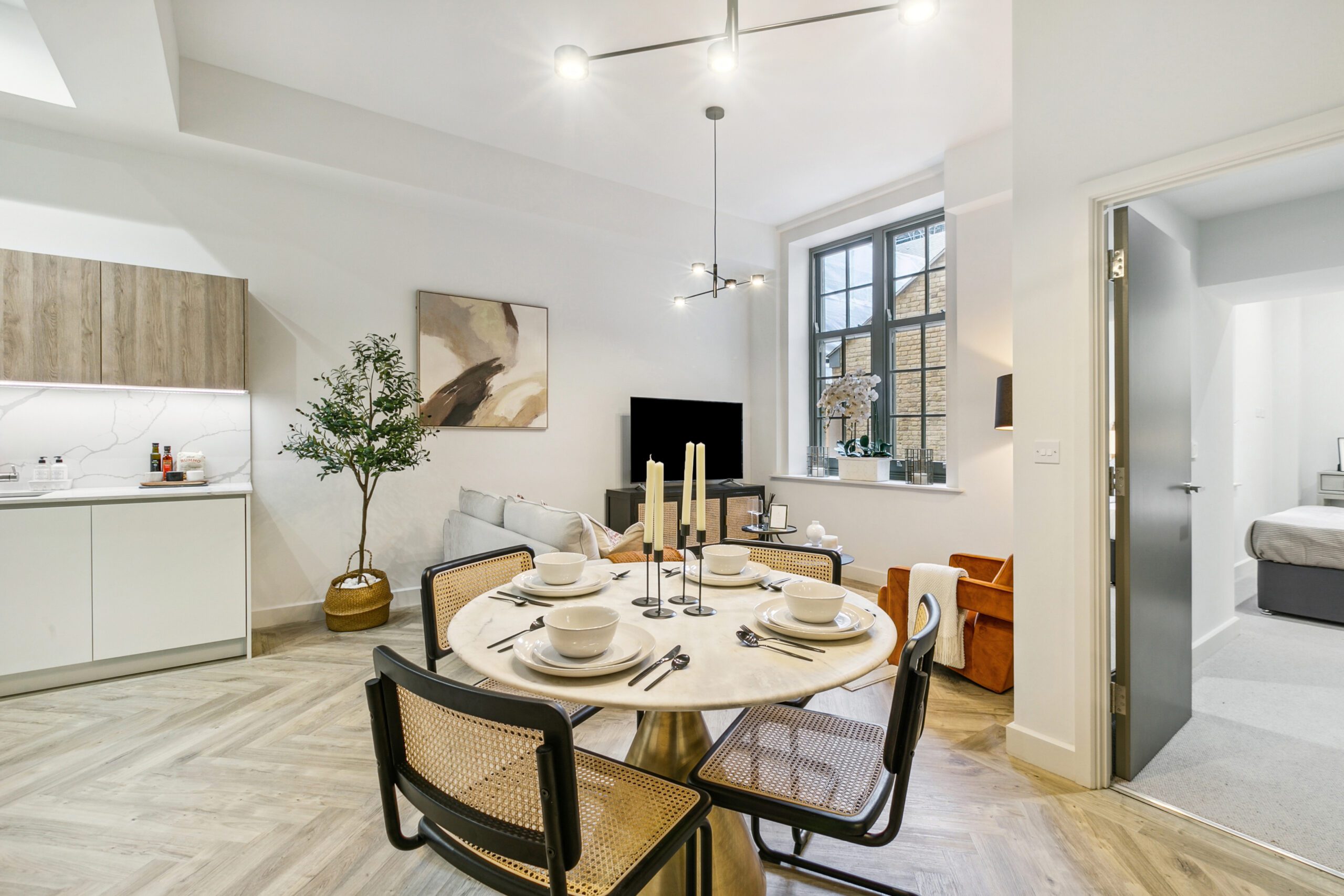 Apartment OR26 is a modern first-floor 1-bedroom residence featuring an open-plan kitchen/dining/living area with white stone worktops, matching full-height stone splashback, integrated Siemens appliances and ample counter space. The bedroom includes a fitted wardrobe, and a modern bathroom featuring Villeroy & Boch sanitaryware, a bathtub and utility area adding convenience, making it the perfect choice for contemporary living in a prime location.