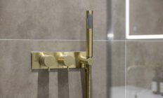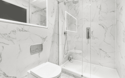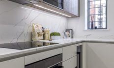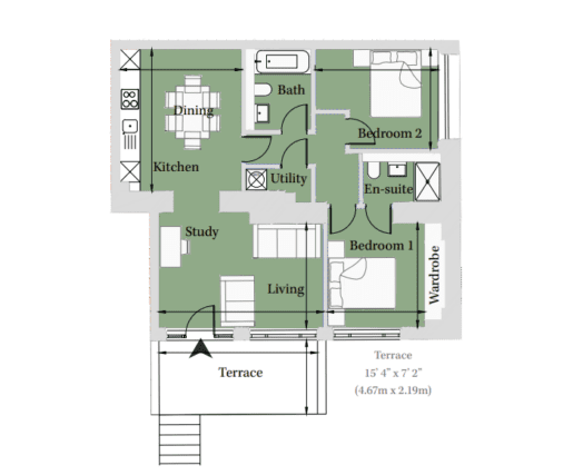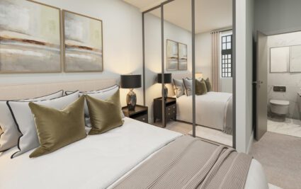 Apartment OR40 is a beautifully designed, dual-aspect two-bedroom home, featuring historic windows that fill the space with natural light. Located on the ground floor, this apartment enjoys a spacious terrace overlooking the private gardens. The layout offers a distinct kitchen and dining space, separate from the living area, ideal for both relaxed evenings and entertaining. The kitchen is finished to a high standard, with integrated Siemens appliances and ample worktop space. The principal bedroom includes fitted wardrobes and a stylish en-suite bathroom. A second double bedroom is served by a contemporary family bathroom with a bath.