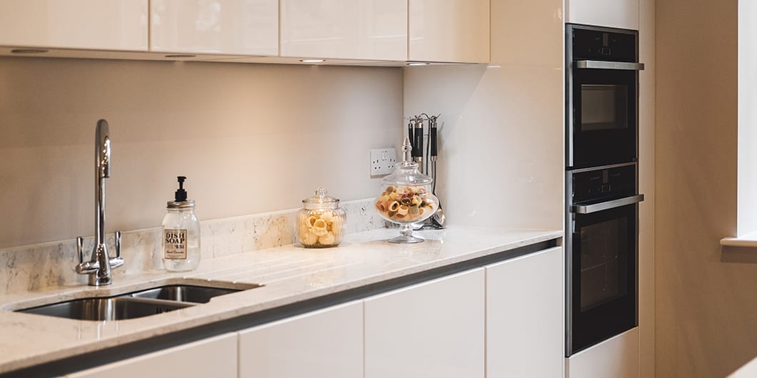 The kitchen is appointed with Neff stainless steel appliances and contemporary stone worktops, in addition, there are views from this space onto the beautiful surrounding landscaping.