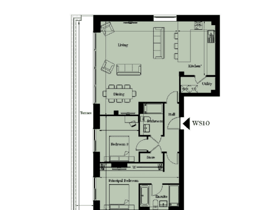WS10 is a stunning two-bedroom apartment, offering a west-facing terrace and set within the stunning South Downs National Park. The spacious open-plan kitchen, dining, and living area is designed for modern living, with elegant doors leading directly onto the terrace, seamlessly blending indoor and outdoor spaces.
