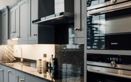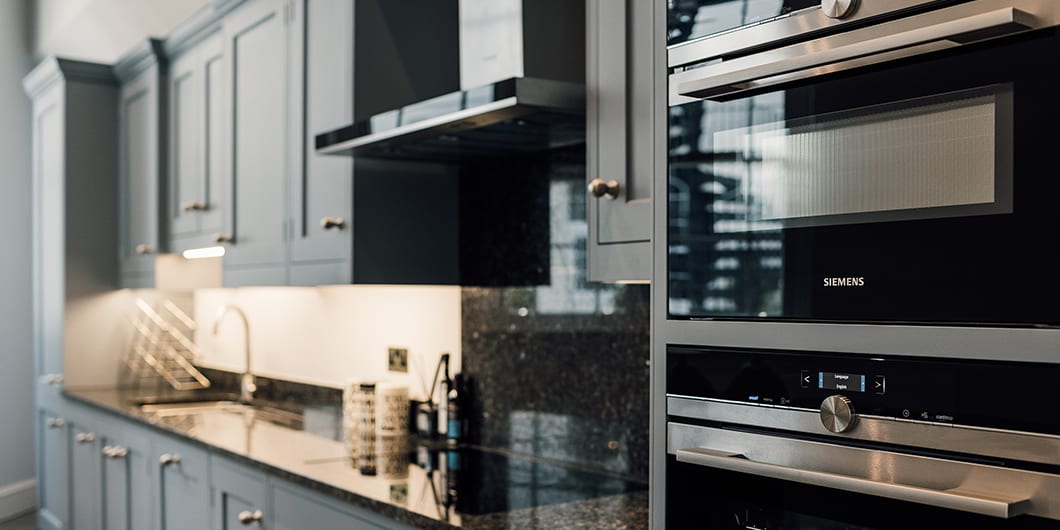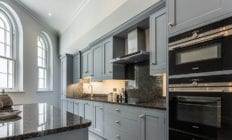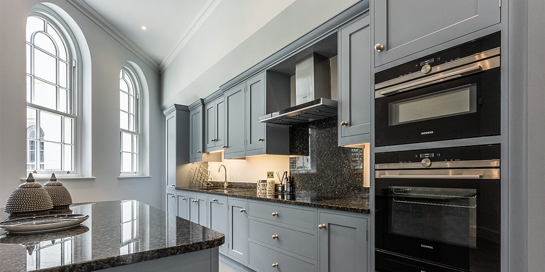 The bespoke shaker style kitchen by Ladbury offers views onto The Mansion’s internal courtyard, and is equipped with stone worktops and fully integrated Siemens appliances, including a combi-microwave, fridge/freezer, dishwasher and wine cooler. There is also a separate utility room accessible via the kitchen.