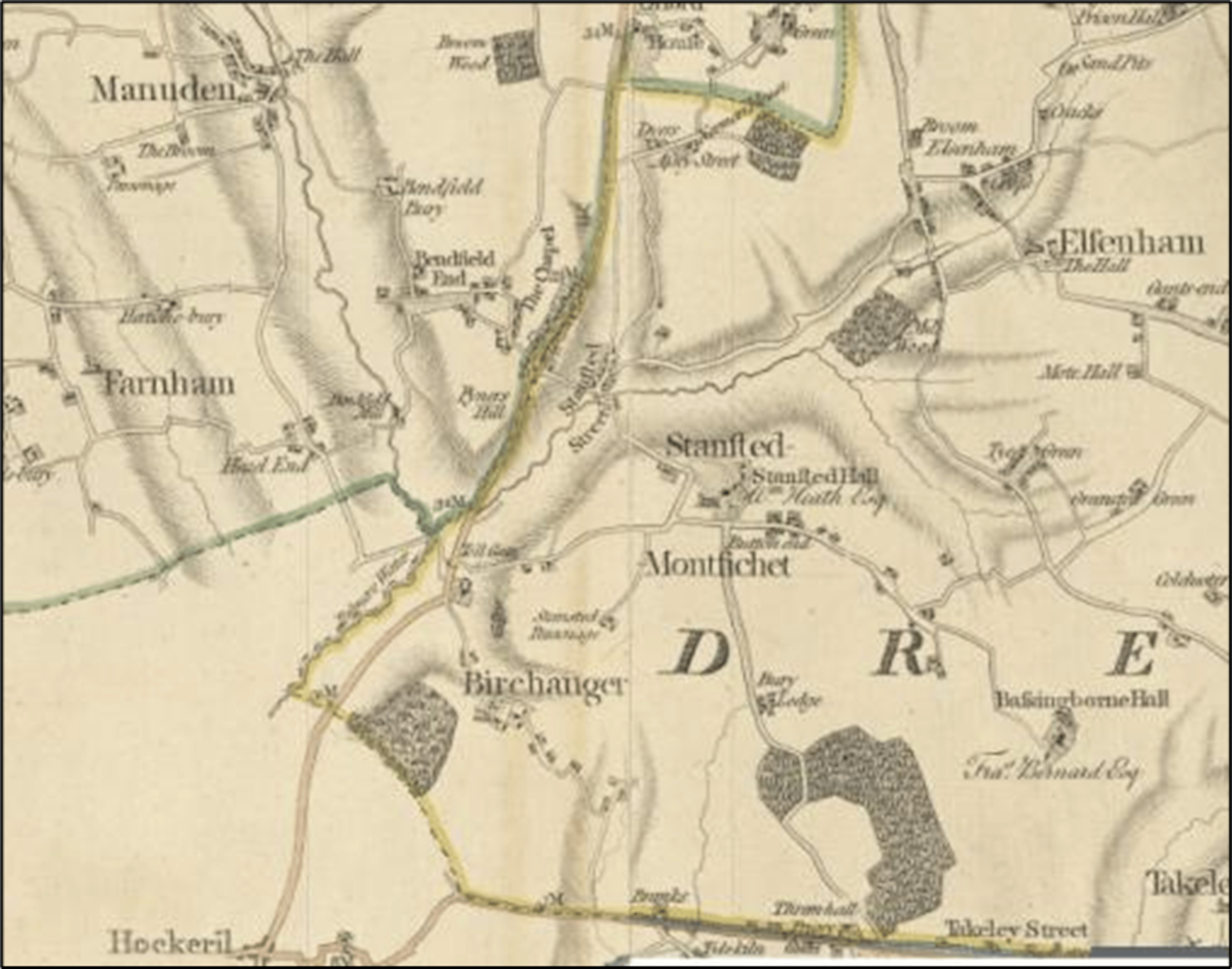 Stansted, or ‘stony place’ was held by Robert de Gernon at Domesday whose family name Mountfitchet was attached to that of the village to distinguish it from the other Stanstead. The Gernons’ park is recorded from the C12 when there were three manors in the parish - Burnells (Stansted Hall) and Thremhall Priory east of the B1383 and Bentfieldbury to the west. The C12 St. Mary’s church and the rebuilt C19 Stansted Hall and hillside park, lie between Lower Street and Burton End, while St. John’s church (built 1889) is centrally located on Chapel Hill. The River Stort flows from Elsenham into the bottom of Lower Street where it was first forded, then heads west to the B1383 and turns south to Stortford.