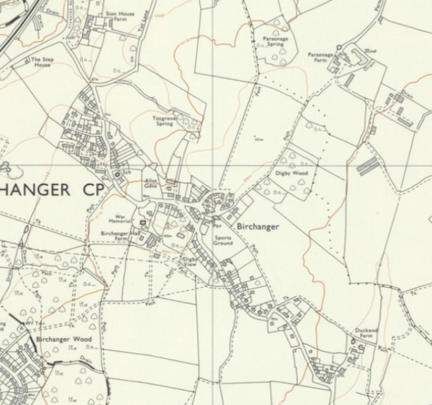 Development since WWII has trebled the population again from 3,000 to an estimated 10,000 . Mountfitchet Estate - municipal housing built to the east of the railway – was swiftly mirrored by various estates west of the B1383 – Blythwood Gardens (1950s), Hargrave Estate, Cannons Mead and Wetherfield (1960s) and Bentfield Gardens (1970s). Smaller developments have been tucked into the eastern slopes at the centre of the village – St John’s Road and Burnells Way(1950s), Meadowcroft, Norman Court, Five Acres and Birchalls (1980s) and Spencer Close off Chapel Hill (1980s). The 1990s gave us Old Bell Close and Windmill Close off Silver Street and the intensification of habitation on Silver Street itself in the form of flats. The 2000s have contributed the Rochford nurseries (Forest Hall, some 700 dwellings), Elms Farm east of the Station and Walpole Meadows north of the village.