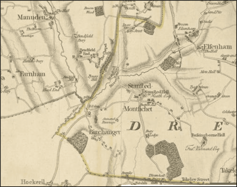 Stansted, or ‘stony place’ was held by Robert de Gernon at Domesday whose family name Mountfitchet was attached to that of the village to distinguish it from the other Stanstead. The Gernons’ park is recorded from the C12 when there were three manors in the parish – Burnells (Stansted Hall) and Thremhall Priory east of the B1383 and Bentfieldbury to the west. The C12 St. Mary’s church and the rebuilt C19 Stansted Hall and hillside park, lie between Lower Street and Burton End, while St. John’s church (built 1889) is centrally located on Chapel Hill. The River Stort flows from Elsenham into the bottom of Lower Street where it was first forded, then heads west to the B1383 and turns south to Stortford.