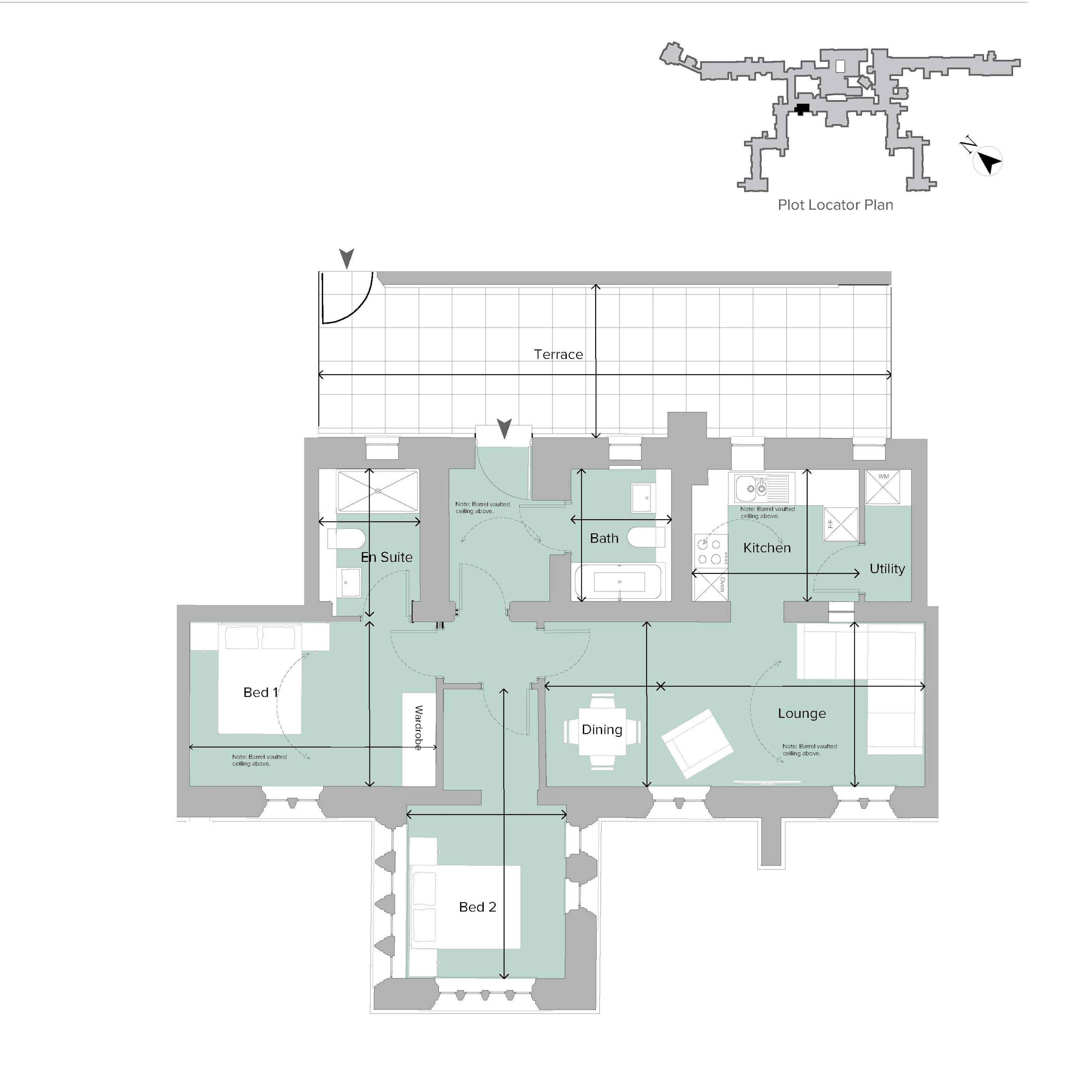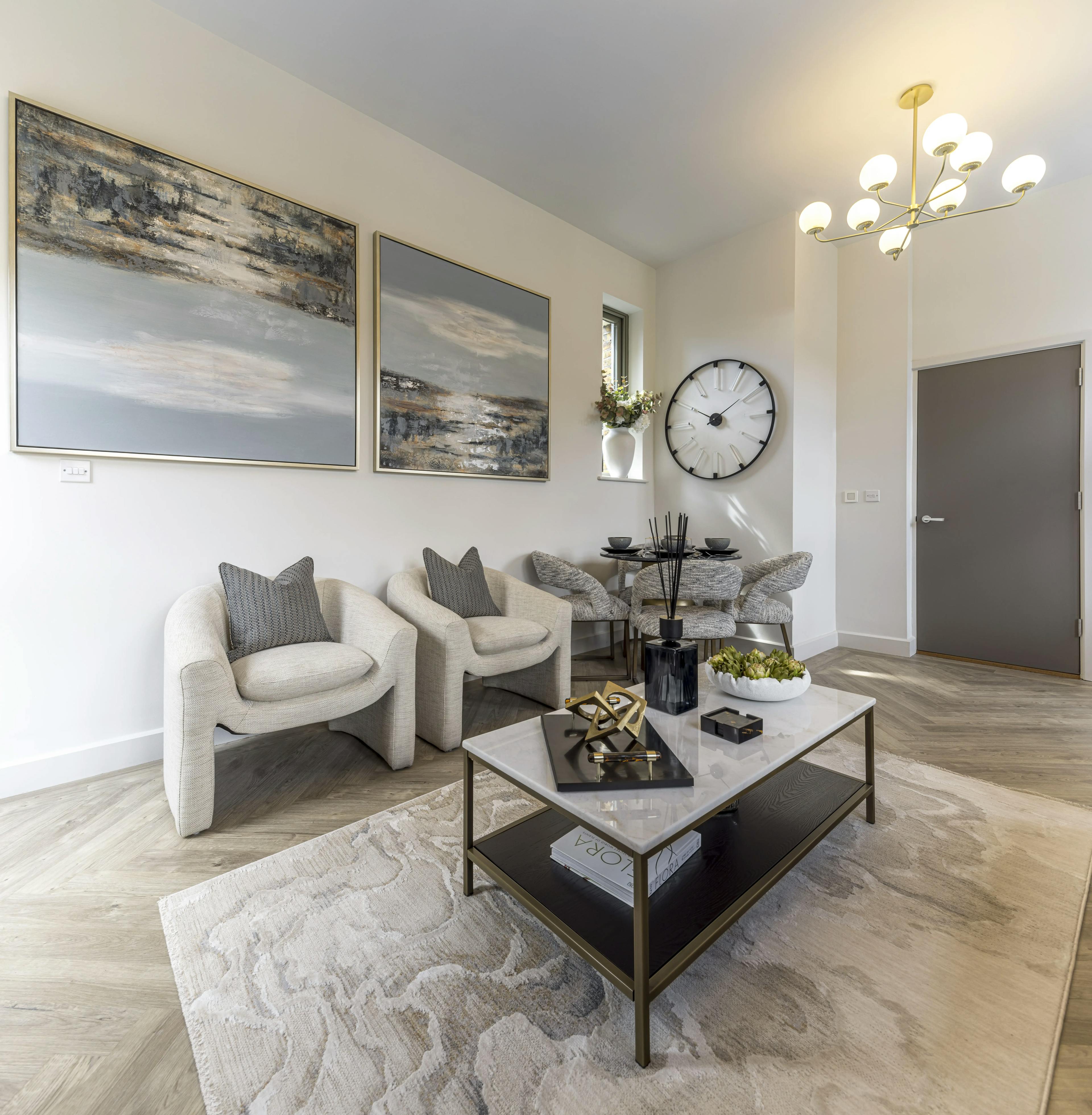 Apartment CW06 is an impressive two-bedroom home located on the ground floor. Spanning approximately 844 sq ft, this generously proportioned apartment combines elegant design with exceptional outdoor space. The layout features a separate kitchen, thoughtfully designed with integrated appliances and ample storage, alongside a spacious dining and lounge area. The principal bedroom is notably large, complete with fitted wardrobes and a luxurious en-suite bathroom with shower. A second well-sized bedroom and a stylish family bathroom with a bath provide comfort and flexibility for guests or family. One of the standout features of CW05 is its expansive terrace, offering stunning views across the beautifully landscaped gardens.