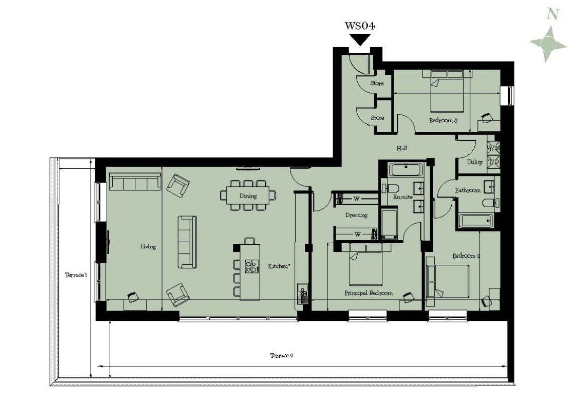 WS04 is a stunning three-bedroom apartment, set within the natural beauty of the South Downs National Park. This spacious home boasts a large wrap-around south and west facing terrace, offering panoramic views over woodland and filling the apartment with natural light. The open-plan living, dining, and kitchen area is designed for modern, effortless living, featuring a kitchen island and sliding doors that open onto both the south and west terraces, creating a seamless indoor-outdoor flow.