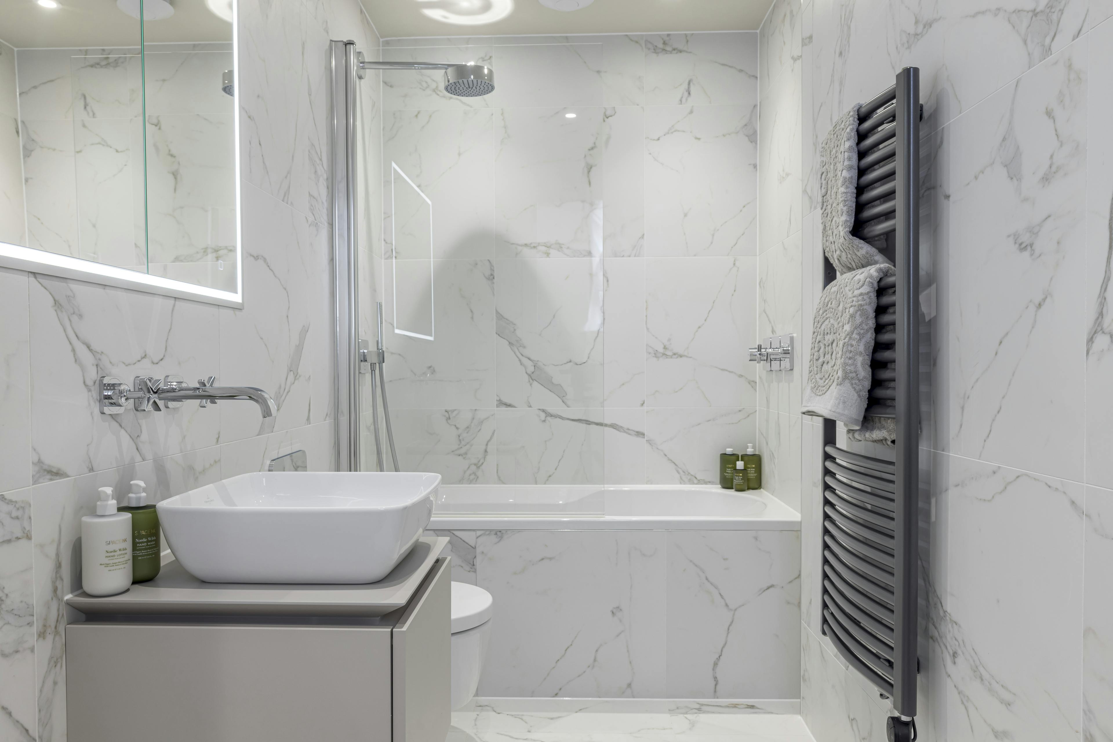 The bedroom features its own dressing area with fitted wardrobes, giving you plenty of storage without compromising on space. The high-spec bathroom includes a bathtub with overhead shower, offering both comfort and flexibility.