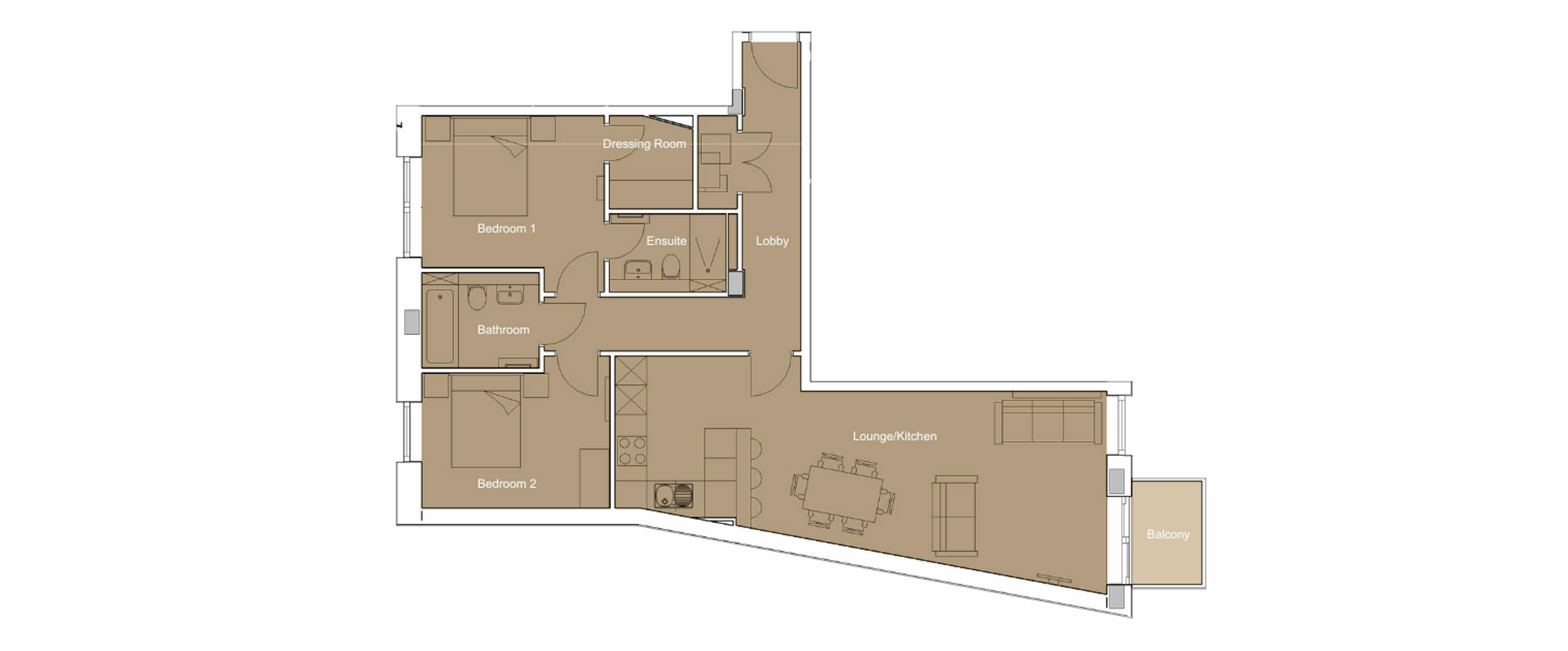 This generous two-bedroom apartment has been carefully designed to balance space, comfort and style. At its centre is an impressive open plan kitchen, living and dining area, stretching over 32 ft in length, with doors opening onto a private balcony overlooking the landscaped courtyard gardens – a perfect retreat for fresh air and relaxation.