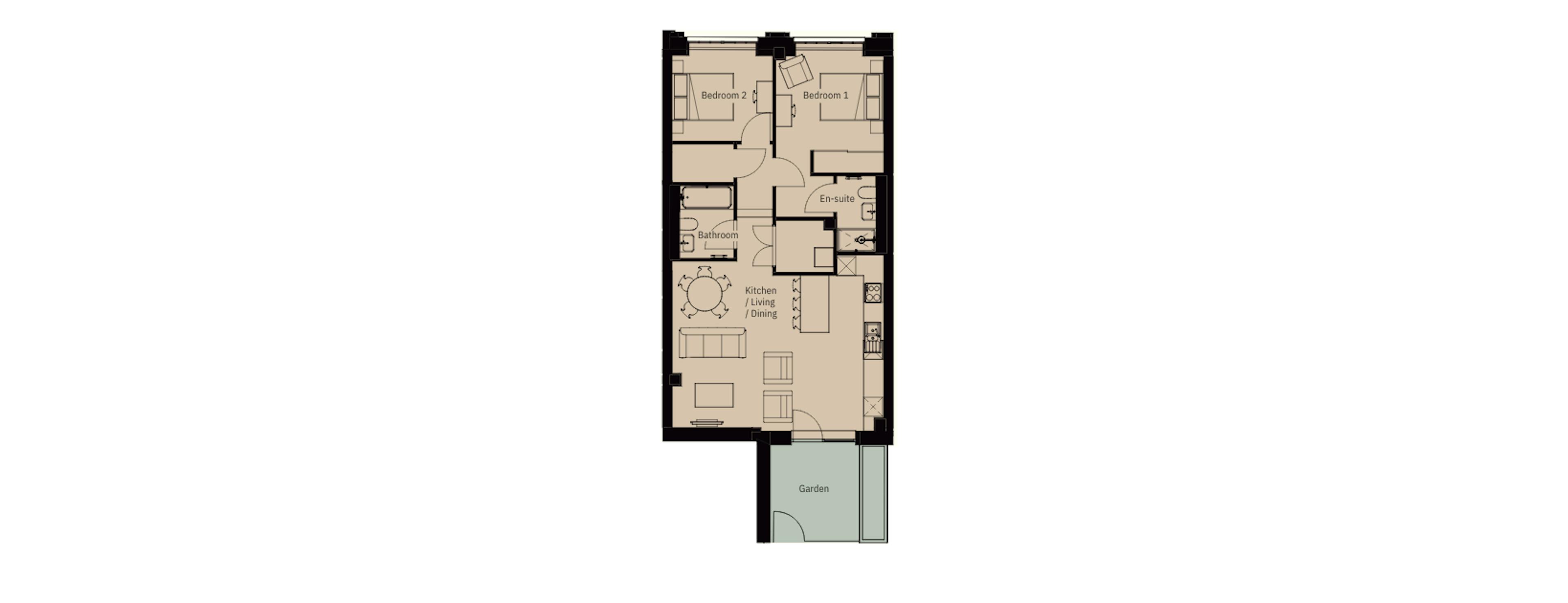Plot N001 is a beautifully arranged ground-floor, two-bedroom apartment featuring its own private entrance, outside terrace and one allocated parking space with EV charging.
