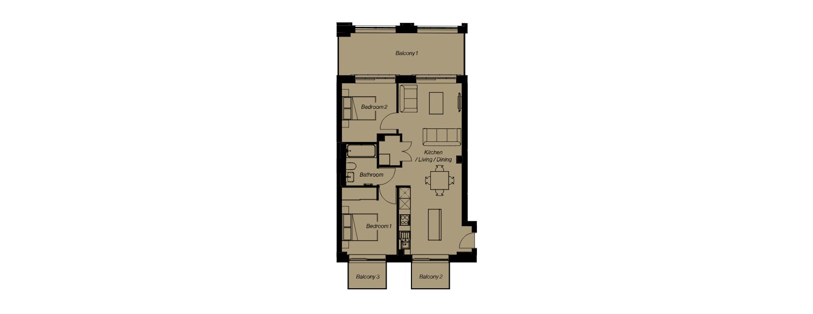 This spacious two bedroom home perfectly combines contemporary design with the building’s rich industrial heritage. The open plan living area runs the full length of the apartment, flooded with natural light from its dual aspect and access to both a terrace and balcony. A sleek Häcker kitchen with Silestone Calacatta worktops, Siemens integrated appliances and a central island creates a stylish focal point for dining and entertaining.