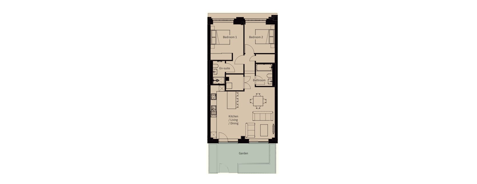 Plot N002 is a beautifully designed ground-floor, two-bedroom apartment featuring its own private entrance, outside terrace and one allocated parking space with EV charging.