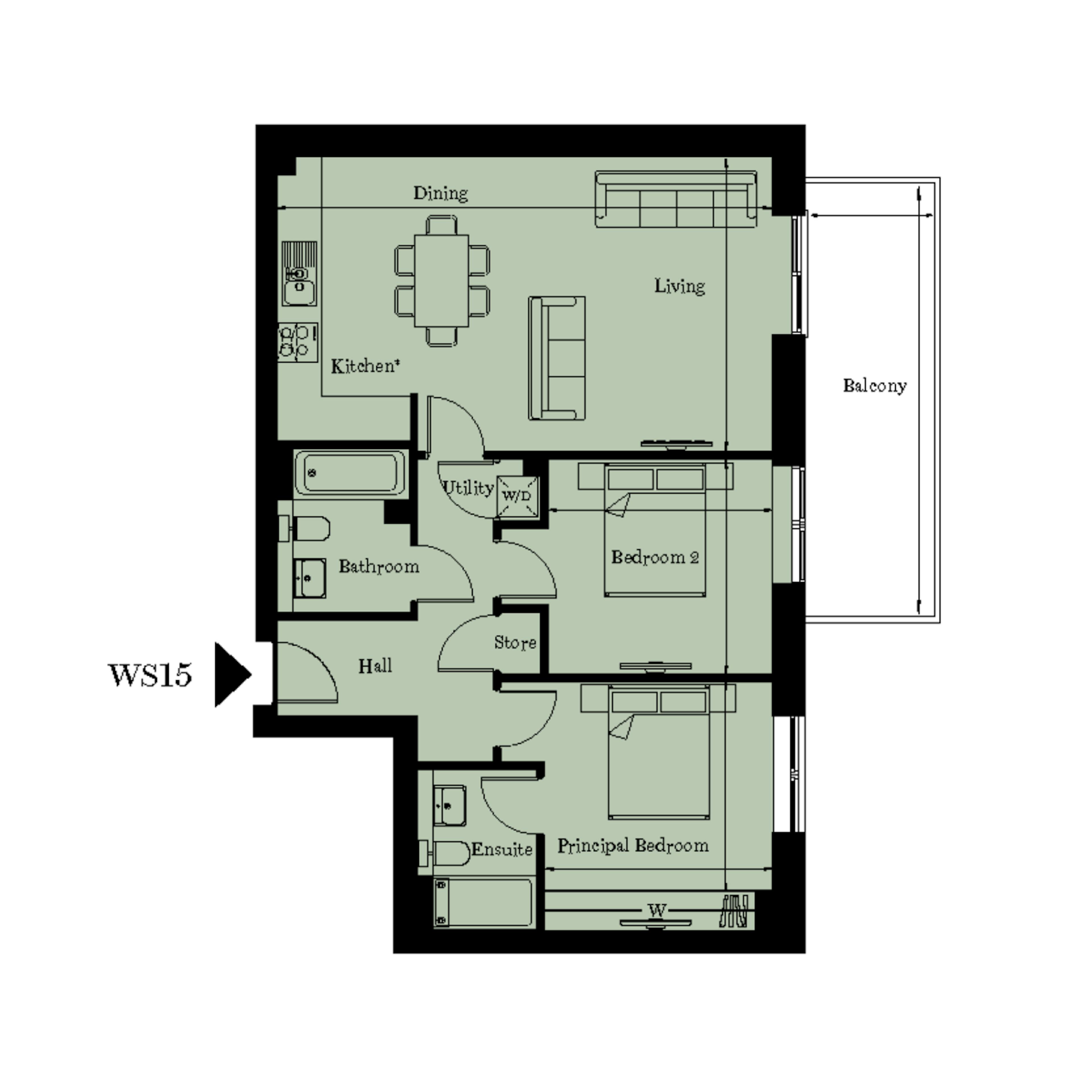 WS15 is a stunning two-bedroom apartment, offering an east-facing balcony and set within the stunning South Downs National Park. The spacious open-plan kitchen, dining, and living area is designed for modern living, with elegant doors leading directly onto the balcony, seamlessly blending indoor and outdoor spaces.