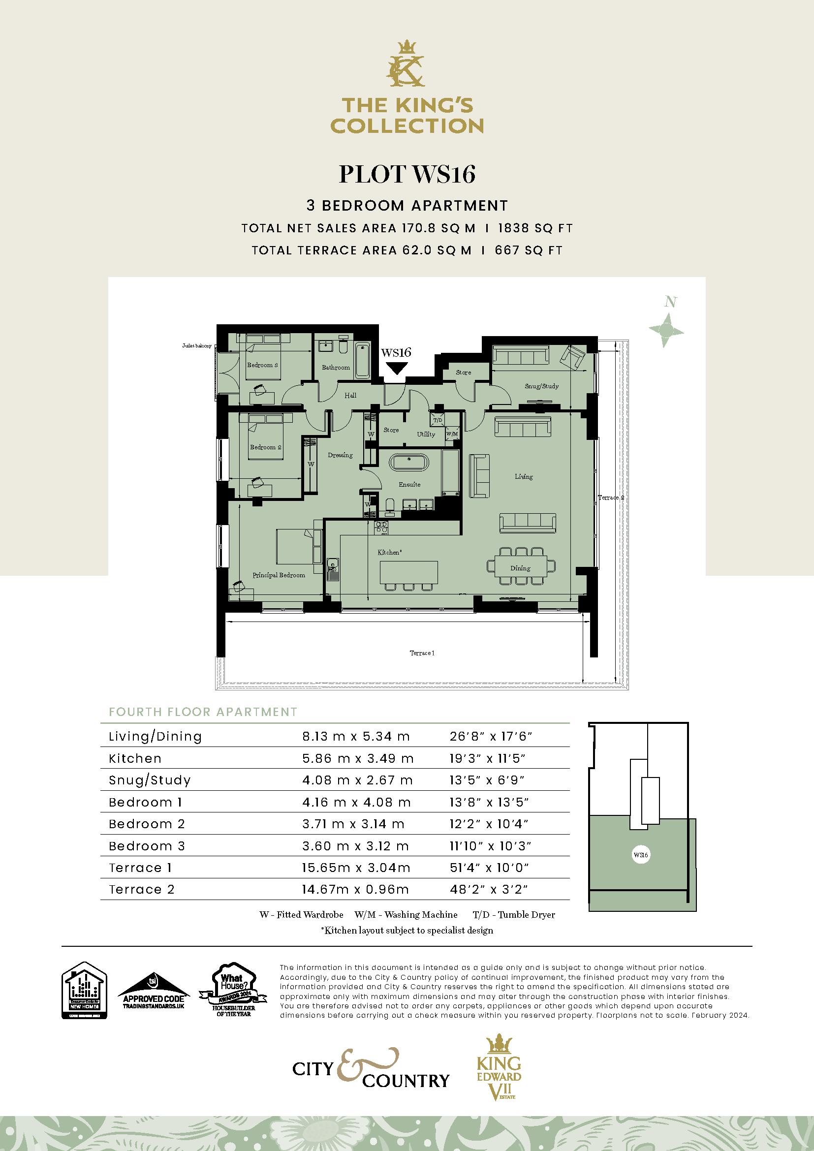 WS16 is a luxurious three-bedroom apartment, offering a large south terrace on the fourth floor of the Imperial House. The spacious open-plan kitchen, dining, and living area is designed for modern living, with large elegant doors leading directly onto the terrace, seamlessly blending indoor and outdoor spaces.